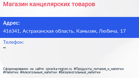 Магазин канцелярских товаров по адресу 416341, Астраханская область, Камызяк, Любича, 17 в дальнейшем Организация, размещена в следующих категориях: