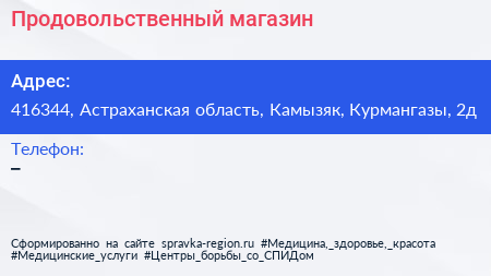 Продовольственный магазин по адресу 416344, Астраханская область, Камызяк, Курмангазы, 2д в дальнейшем Организация, размещена в следующих категориях: