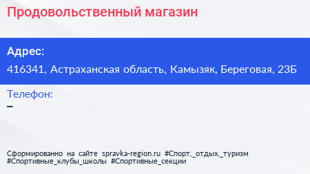 Продовольственный магазин по адресу 416341, Астраханская область, Камызяк, Береговая, 23Б в дальнейшем Организация, размещена в следующих категориях: