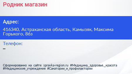 Родник, магазин по адресу 416340, Астраханская область, Камызяк, Максима Горького, 86з в дальнейшем Организация, размещена в следующих категориях: