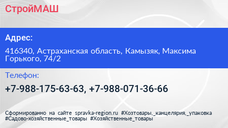 СтройМАШ по адресу 416340, Астраханская область, Камызяк, Максима Горького, 74/2 в дальнейшем Организация, размещена в следующих категориях: