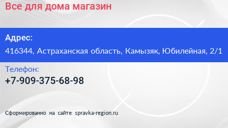 Все для дома, магазин по адресу 416344, Астраханская область, Камызяк, Юбилейная, 2/1 в дальнейшем Организация, размещена в следующих категориях: