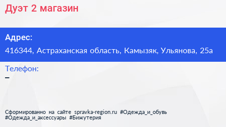 Дуэт-2, магазин по адресу 416344, Астраханская область, Камызяк, Ульянова, 25а в дальнейшем Организация, размещена в следующих категориях: