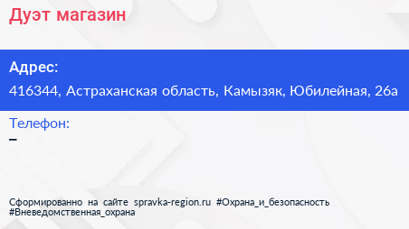 Дуэт, магазин по адресу 416344, Астраханская область, Камызяк, Юбилейная, 26а в дальнейшем Организация, размещена в следующих категориях: