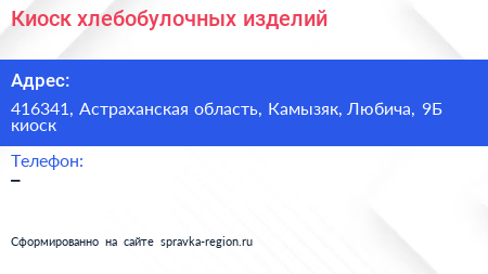 Киоск хлебобулочных изделий по адресу 416341, Астраханская область, Камызяк, Любича, 9Б киоск в дальнейшем Организация, размещена в следующих категориях: