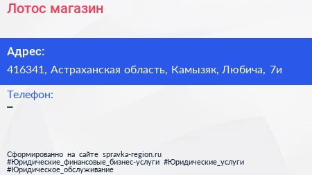 Лотос, магазин по адресу 416341, Астраханская область, Камызяк, Любича, 7и в дальнейшем Организация, размещена в следующих категориях:
