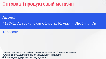 Оптовка №1, продуктовый магазин по адресу 416341, Астраханская область, Камызяк, Любича, 7Б в дальнейшем Организация, размещена в следующих категориях: