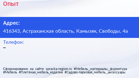 Опыт по адресу 416343, Астраханская область, Камызяк, Свободы, 4а в дальнейшем Организация, размещена в следующих категориях: