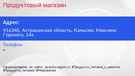 Продуктовый магазин по адресу 416340, Астраханская область, Камызяк, Максима Горького, 14а в дальнейшем Организация, размещена в следующих категориях: