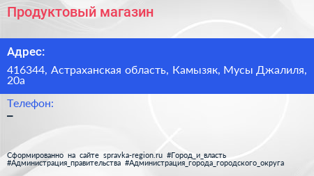 Продуктовый магазин по адресу 416344, Астраханская область, Камызяк, Мусы Джалиля, 20а в дальнейшем Организация, размещена в следующих категориях: