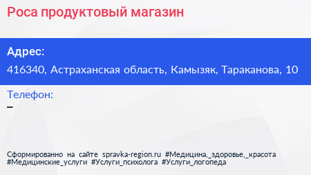 Роса, продуктовый магазин по адресу 416340, Астраханская область, Камызяк, Тараканова, 10 в дальнейшем Организация, размещена в следующих категориях: