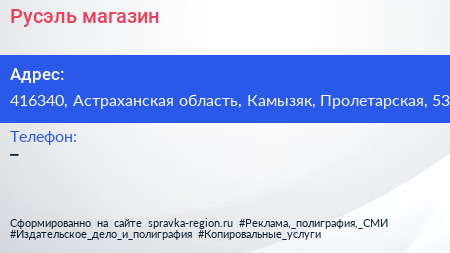 Русэль, магазин по адресу 416340, Астраханская область, Камызяк, Пролетарская, 53 в дальнейшем Организация, размещена в следующих категориях: