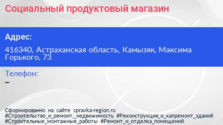 Социальный, продуктовый магазин по адресу 416340, Астраханская область, Камызяк, Максима Горького, 73 в дальнейшем Организация, размещена в следующих категориях: