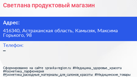 Светлана, продуктовый магазин по адресу 416340, Астраханская область, Камызяк, Максима Горького, 98 в дальнейшем Организация, размещена в следующих категориях: