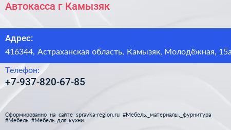 Автокасса, г. Камызяк по адресу 416344, Астраханская область, Камызяк, Молодёжная, 15а в дальнейшем Организация, размещена в следующих категориях:
