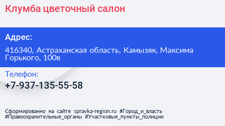 Клумба, цветочный салон по адресу 416340, Астраханская область, Камызяк, Максима Горького, 100в в дальнейшем Организация, размещена в следующих категориях: