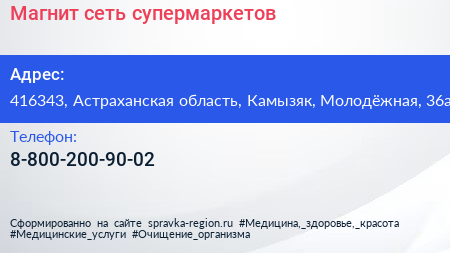Магнит, сеть супермаркетов по адресу 416343, Астраханская область, Камызяк, Молодёжная, 36а в дальнейшем Организация, размещена в следующих категориях: