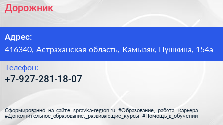 Дорожник по адресу 416340, Астраханская область, Камызяк, Пушкина, 154а в дальнейшем Организация, размещена в следующих категориях: