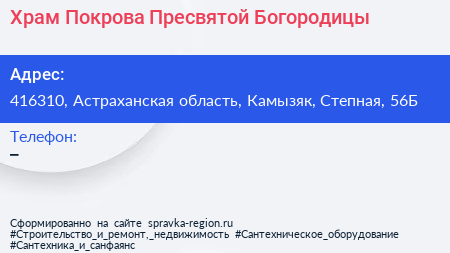 Храм Покрова Пресвятой Богородицы по адресу 416310, Астраханская область, Камызяк, Степная, 56Б в дальнейшем Организация, размещена в следующих категориях: