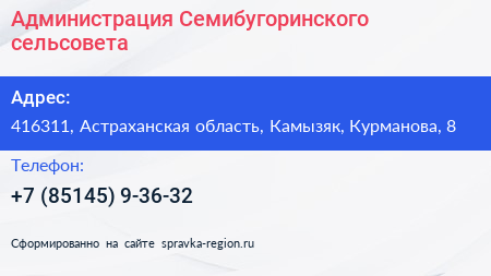 Администрация Семибугоринского сельсовета по адресу 416311, Астраханская область, Камызяк, Курманова, 8 в дальнейшем Организация, размещена в следующих категориях: