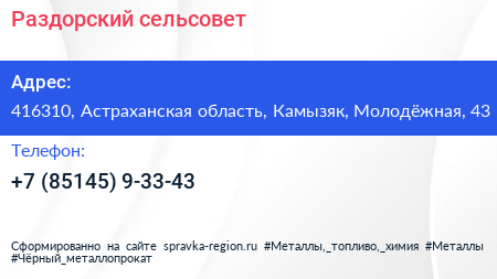 Раздорский сельсовет по адресу 416310, Астраханская область, Камызяк, Молодёжная, 43 в дальнейшем Организация, размещена в следующих категориях: