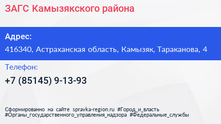 ЗАГС Камызякского района по адресу 416340, Астраханская область, Камызяк, Тараканова, 4 в дальнейшем Организация, размещена в следующих категориях: