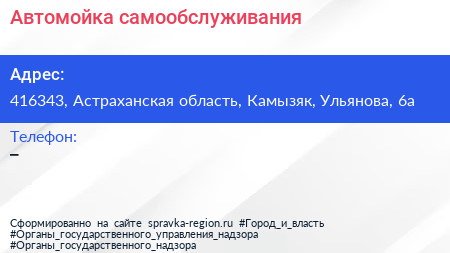 Автомойка самообслуживания по адресу 416343, Астраханская область, Камызяк, Ульянова, 6а в дальнейшем Организация, размещена в следующих категориях: