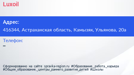 Luxoil по адресу 416344, Астраханская область, Камызяк, Ульянова, 20а в дальнейшем Организация, размещена в следующих категориях: