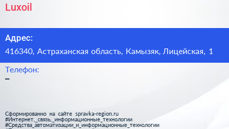 Luxoil по адресу 416340, Астраханская область, Камызяк, Лицейская, 1 в дальнейшем Организация, размещена в следующих категориях: