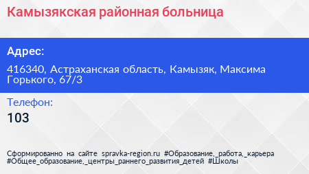 Камызякская районная больница по адресу 416340, Астраханская область, Камызяк, Максима Горького, 67/3 в дальнейшем Организация, размещена в следующих категориях: