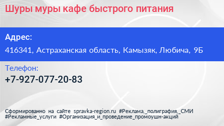 Шуры-муры, кафе быстрого питания по адресу 416341, Астраханская область, Камызяк, Любича, 9Б в дальнейшем Организация, размещена в следующих категориях: