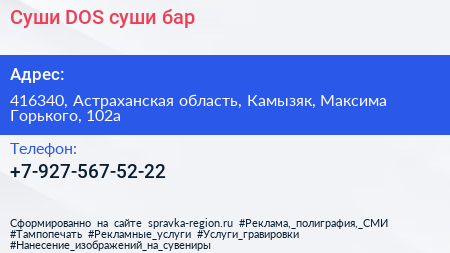 Суши-DOS, суши-бар по адресу 416340, Астраханская область, Камызяк, Максима Горького, 102а в дальнейшем Организация, размещена в следующих категориях: