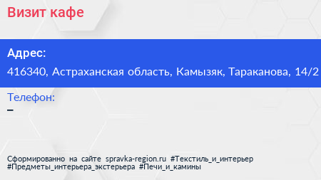 Визит, кафе по адресу 416340, Астраханская область, Камызяк, Тараканова, 14/2 в дальнейшем Организация, размещена в следующих категориях: