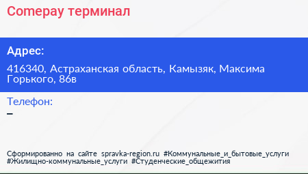 Comepay, терминал по адресу 416340, Астраханская область, Камызяк, Максима Горького, 86в в дальнейшем Организация, размещена в следующих категориях: