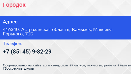 Городок по адресу 416340, Астраханская область, Камызяк, Максима Горького, 71Б в дальнейшем Организация, размещена в следующих категориях: