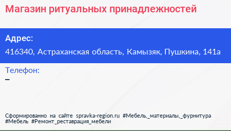Магазин ритуальных принадлежностей по адресу 416340, Астраханская область, Камызяк, Пушкина, 141а в дальнейшем Организация, размещена в следующих категориях: