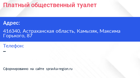 Платный общественный туалет по адресу 416340, Астраханская область, Камызяк, Максима Горького, 87 в дальнейшем Организация, размещена в следующих категориях:
