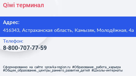 Qiwi, терминал по адресу 416343, Астраханская область, Камызяк, Молодёжная, 4а в дальнейшем Организация, размещена в следующих категориях: