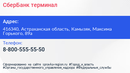 СберБанк, терминал по адресу 416340, Астраханская область, Камызяк, Максима Горького, 89а в дальнейшем Организация, размещена в следующих категориях: