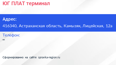 ЮГ-ПЛАТ, терминал по адресу 416340, Астраханская область, Камызяк, Лицейская, 12а в дальнейшем Организация, размещена в следующих категориях: