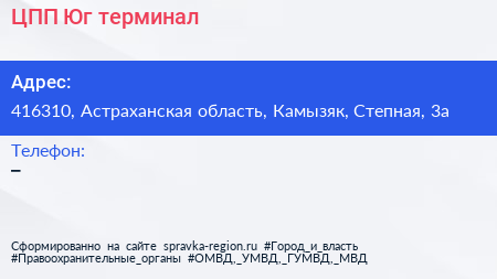 ЦПП-Юг, терминал по адресу 416310, Астраханская область, Камызяк, Степная, 3а в дальнейшем Организация, размещена в следующих категориях: