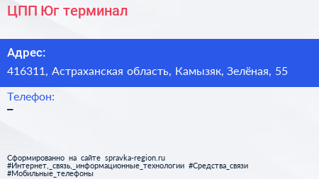 ЦПП-Юг, терминал по адресу 416311, Астраханская область, Камызяк, Зелёная, 55 в дальнейшем Организация, размещена в следующих категориях: