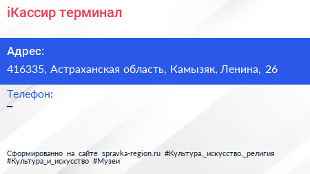 iКассир, терминал по адресу 416335, Астраханская область, Камызяк, Ленина, 26 в дальнейшем Организация, размещена в следующих категориях: