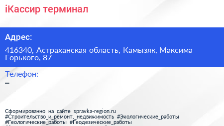 iКассир, терминал по адресу 416340, Астраханская область, Камызяк, Максима Горького, 87 в дальнейшем Организация, размещена в следующих категориях: