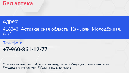 Бал, аптека по адресу 416343, Астраханская область, Камызяк, Молодёжная, 6а/1 в дальнейшем Организация, размещена в следующих категориях: