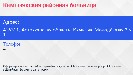 Камызякская районная больница по адресу 416311, Астраханская область, Камызяк, Молодёжная 2-я, 1 в дальнейшем Организация, размещена в следующих категориях: