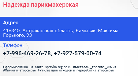 Надежда, парикмахерская по адресу 416340, Астраханская область, Камызяк, Максима Горького, 93 в дальнейшем Организация, размещена в следующих категориях: