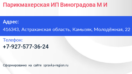 Парикмахерская, ИП Виноградова М.И. по адресу 416343, Астраханская область, Камызяк, Молодёжная, 22 в дальнейшем Организация, размещена в следующих категориях: