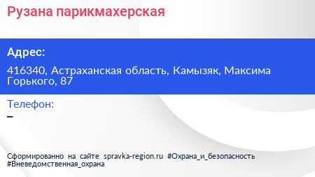 Рузана, парикмахерская по адресу 416340, Астраханская область, Камызяк, Максима Горького, 87 в дальнейшем Организация, размещена в следующих категориях: