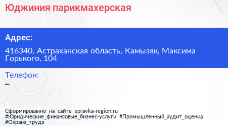Юджиния, парикмахерская по адресу 416340, Астраханская область, Камызяк, Максима Горького, 104 в дальнейшем Организация, размещена в следующих категориях: